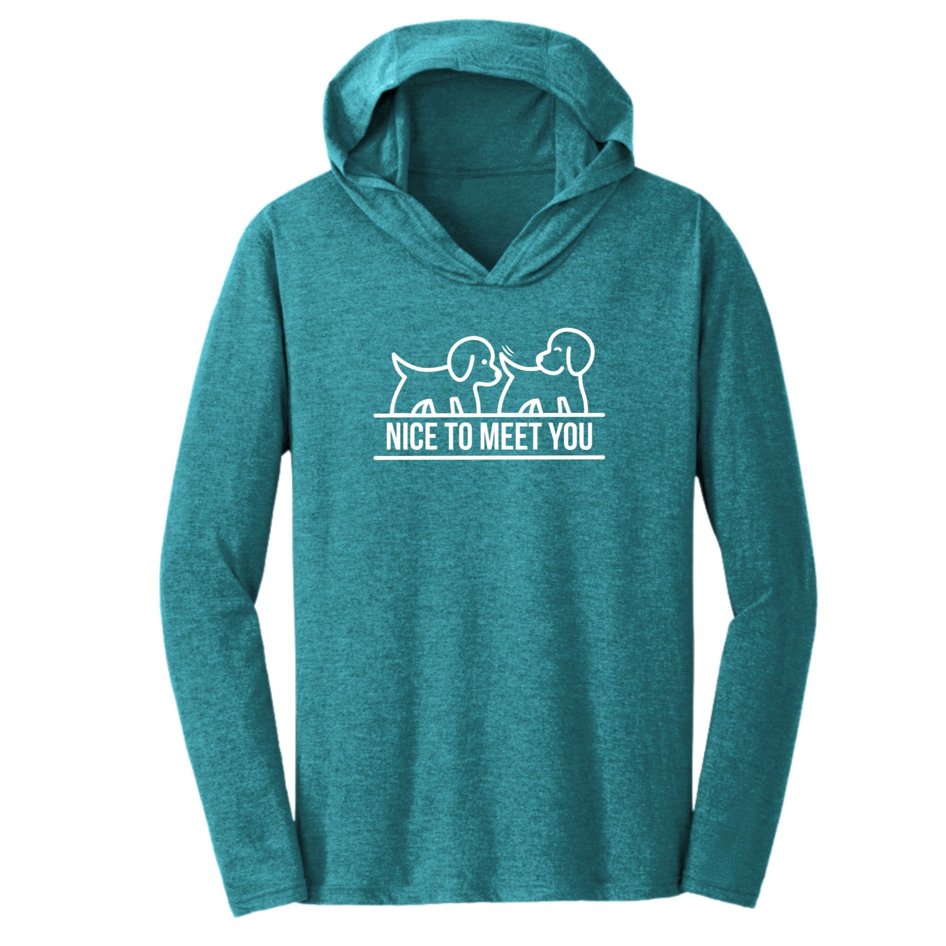 Our Nice To Meet You hoodie is designed for dog lovers who have a sense of humor and know the real way pups say hello. This triblend t-shirt hoodie is soft, lightweight, and packed with personality—just like your furry best friend. Featuring two dogs mid-sniff (you know, that sniff) - it’s a playful nod to the canine greeting we all know and love.