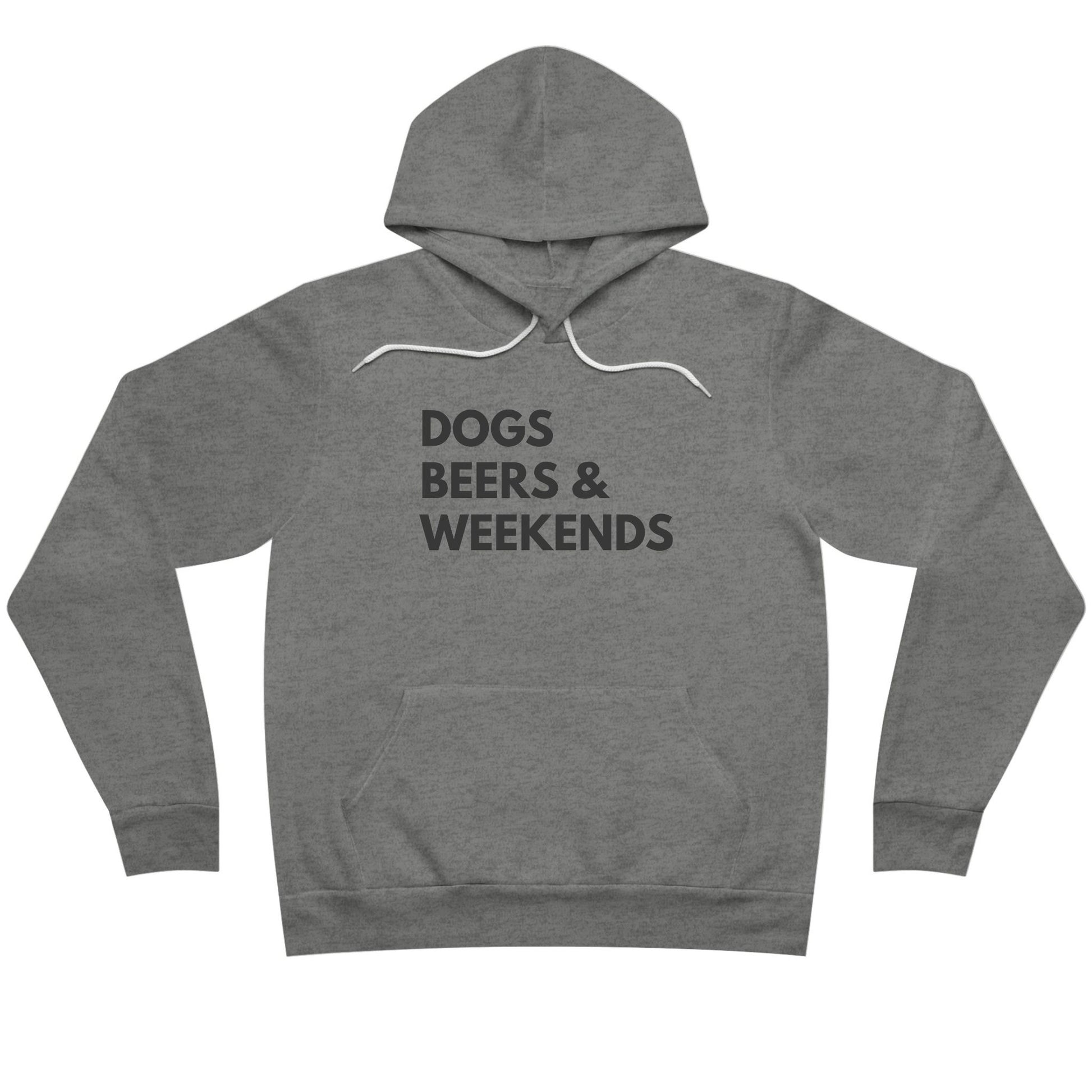 This minimalist design carries a playful phrase "Dogs, Beers & Weekends" and is perfect for any casual event, when you are relaxing with your puppy at home or even over that lazy weekend. Made of super-soft sponge fleece, this sleek grey hoodie will keep you warm and snug regardless of where you are clinging on--a favorite brewery or walking your dog in the morning.