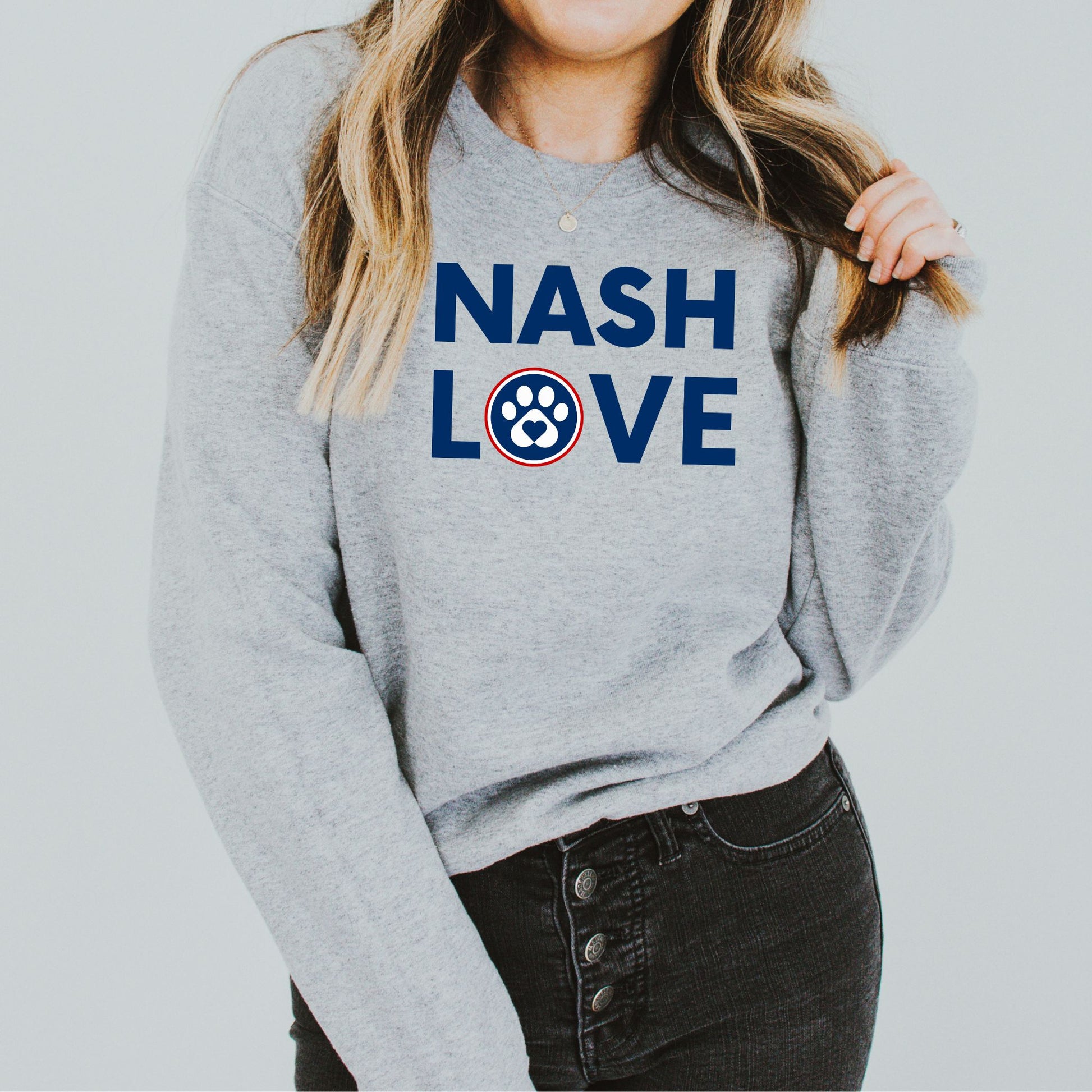Show off your love for Nashville and pets alike with our "Nash Love" Sweatshirt! This cozy favorite isn’t just a shoutout to Music City; it’s also a little tribute to our furry friends. Featuring our heart-shaped paw print tucked right into the ‘O’ in ‘Love,’ this sweatshirt is perfect for animal lovers who carry Nashville close to their hearts. Whether you're strolling down Broadway, heading out to a pet-friendly event or hanging at home at home with your furry friend, this is the go-to piece for anyone who loves their pets and Nashville, TN.