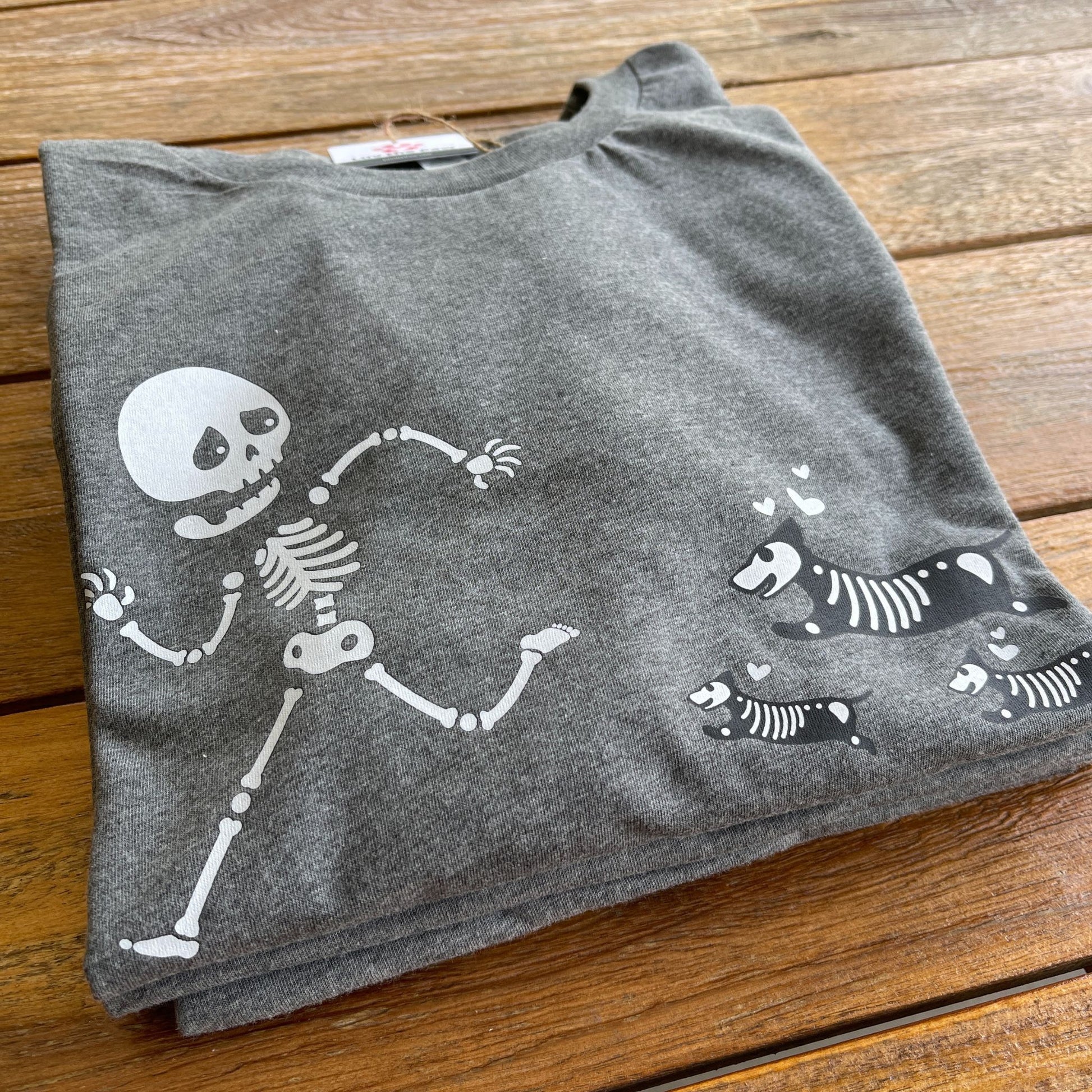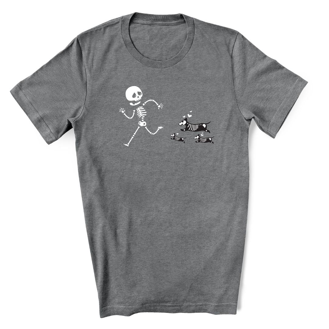 Love at first sight for this pack of dogs. What dog doesn't love bones. You're guaranteed to get a few chuckles wearing this funny t-shirt during the halloween season. It features a pack of skeleton dogs chasing a spooky skeleton. Who's the scared one here! A great tee for dog owners or those with a sense of humor for sure!